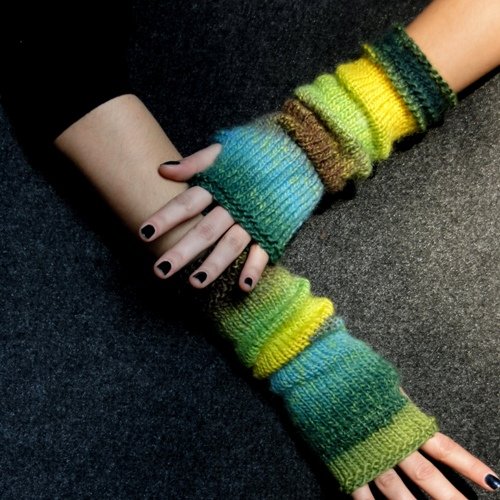 Kolejna propozycja na rękę - ozdoba i ochrona przed chłodem. Długie (30cm), ciepłe mitenki wykonane na drutach z miłej w dotyku włóczki (100% wełna )-bezszwowe. Przepiękne kolory: odcienie zieleni, turkusu, brązu i cytryny...ubarwią każdy strój. Polecam. Ze względu na układ barw - pojedynczy egzemplarz.