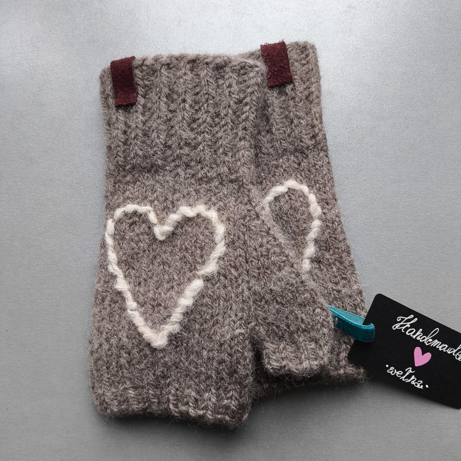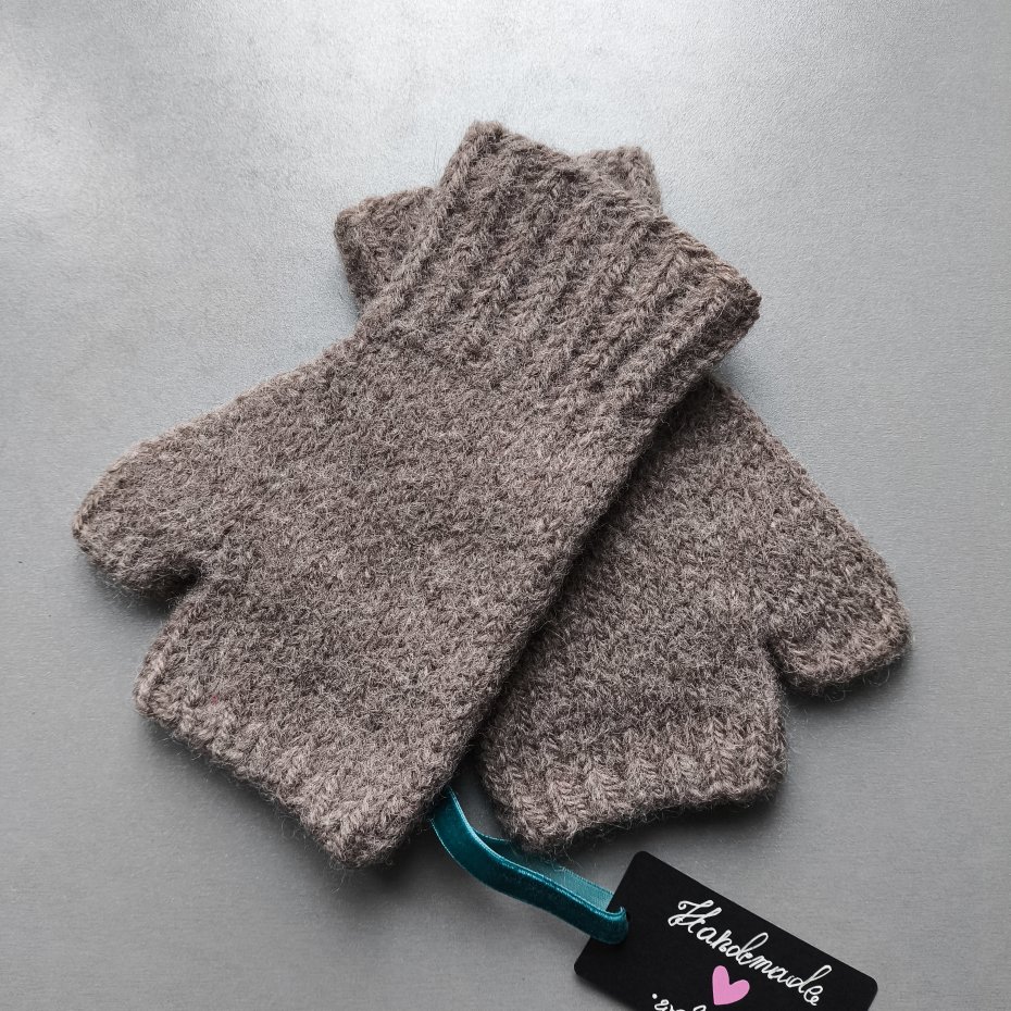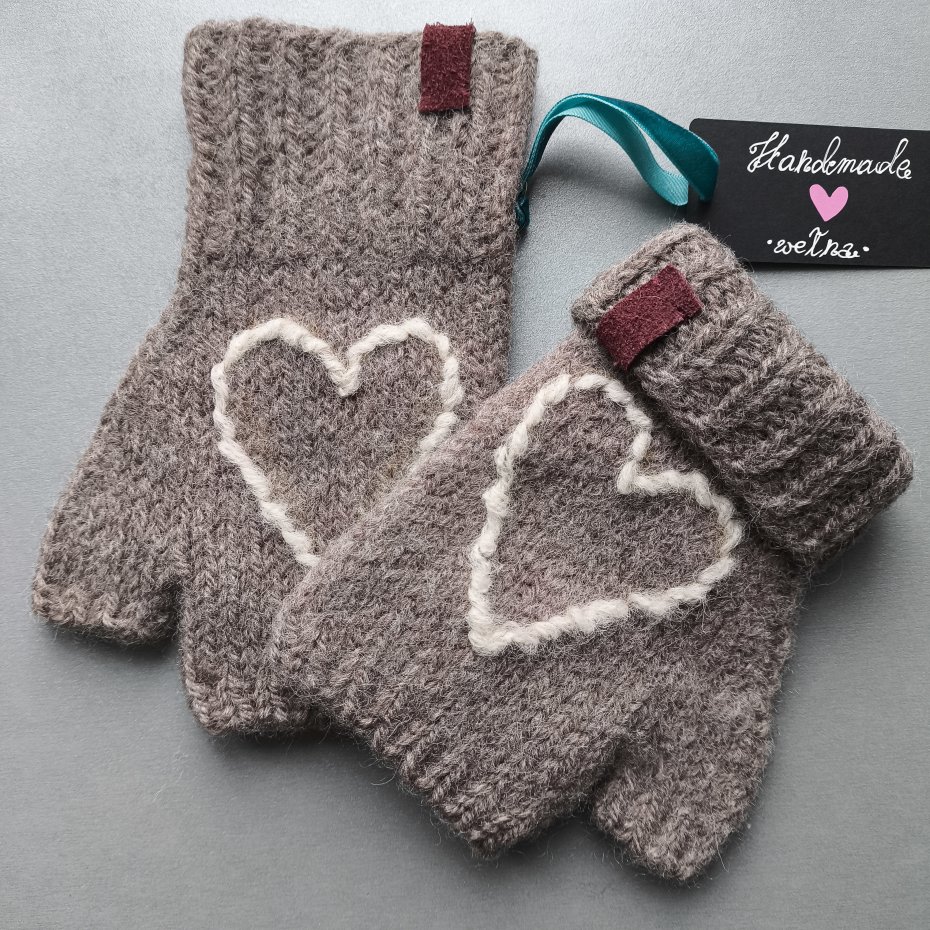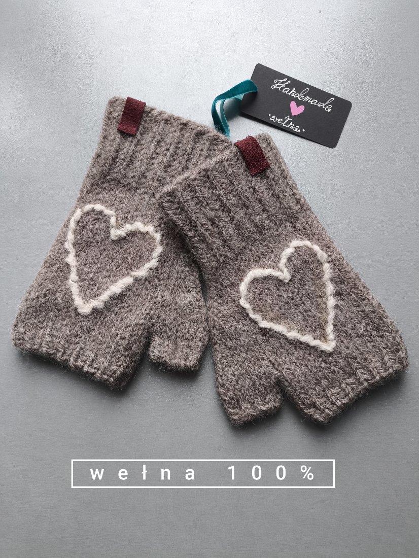 Wełniane mitenki w kolorze ciemnego beżu ze skórzaną bordową naszywką, którą w łatwy sposób można opcjonalnie usunąć.