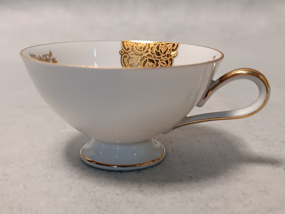 Bogate złote zdobienia na uchwycie, nóżce i brzegach nadają filiżance wyjątkowego charakteru.