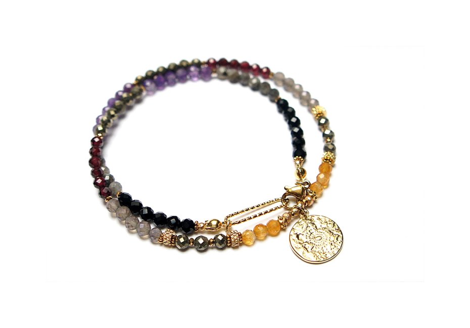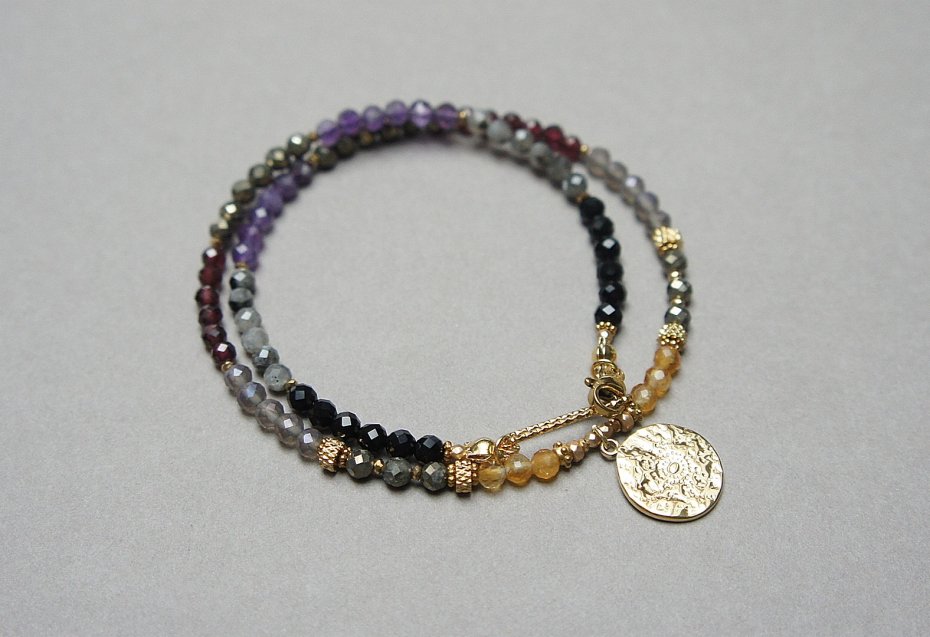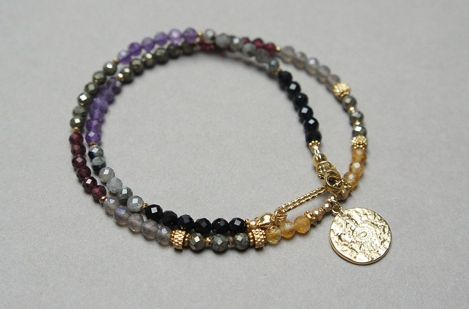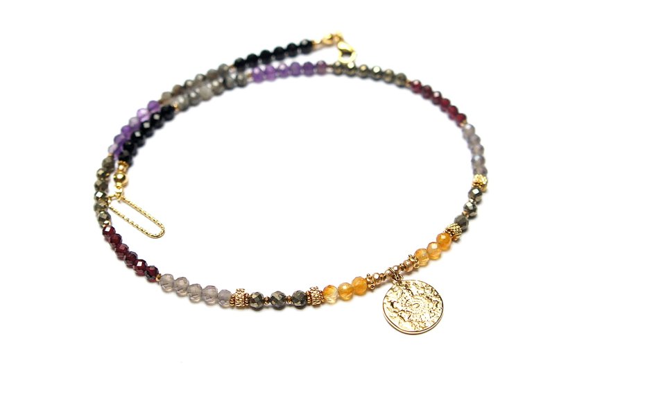 Krótki, delikatny naszyjnik wykonany w całości ze stali szlachetnej pozłacanej oraz naturalnych, szlachetnych kamieni - fasetowane granaty [4mm], cytryn fasetowany [3,5mm], ametyst fasetowany [4mm], kwarc dymny, platerowany [4mm], larvikit fasetowany [4mm], piryt fasetowany [3,5mm], onyks fasetowane [4mm], hematyt fasetowany, platerowany [3mm i 2mm], przekładek z hematytu [1mm]. Naszyjnik o długości ok. 43cm. Biżuteria ozdobnie zapakowana.