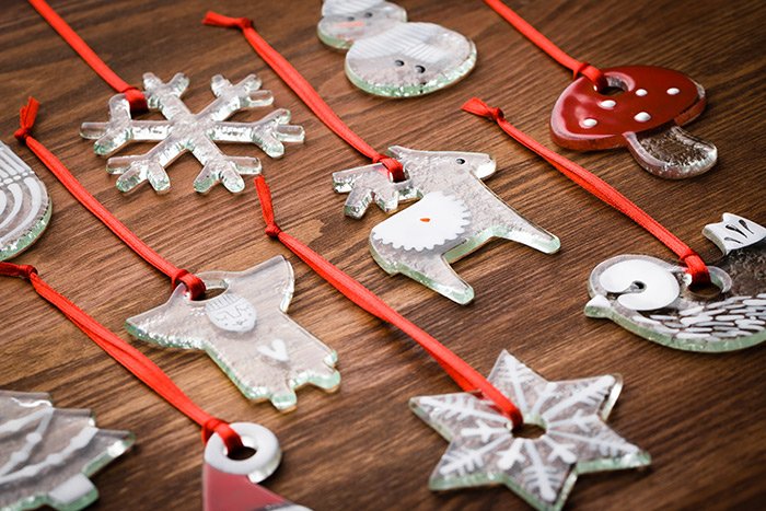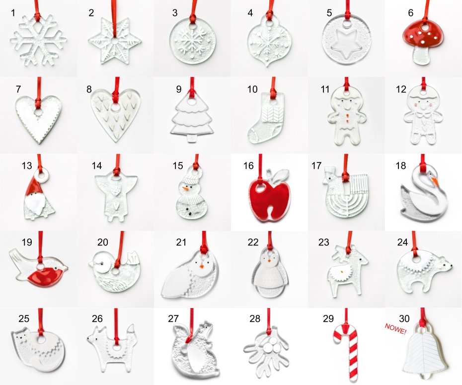 Zestaw dziecięciu autorskich świątecznych zawieszek na choinkę wykonanych ze szkła metodą fusingu. Elementy wykonane ze szkła bezbarwnego z ręcznie malowanym i wypalanym wzorem na powierzchni. Spód szkła posiada delikatną fakturę ciekawie odbijającą światło.