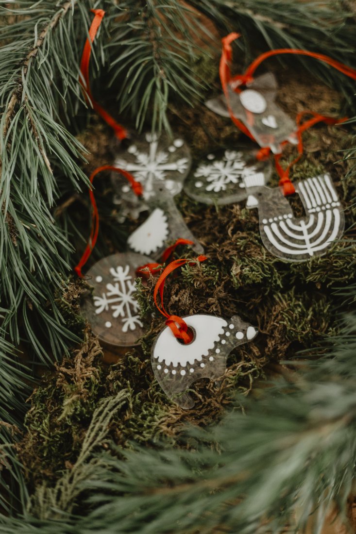 Ozdoby zawieszone na satynowych tasiemkach, zapakowane w kartonikowe pudełeczko wypełnione siankiem.