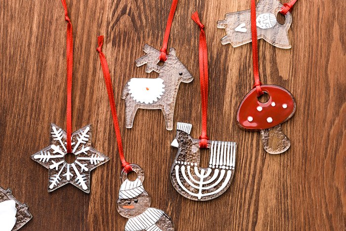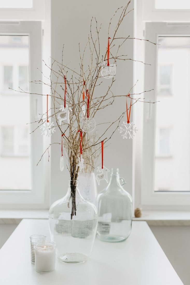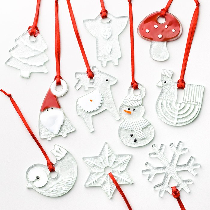 Zestaw czterech autorskich świątecznych zawieszek na choinkę wykonanych ze szkła metodą fusingu. Elementy wykonane ze szkła bezbarwnego z ręcznie malowanym i wypalanym wzorem na powierzchni. Spód szkła posiada delikatną fakturę ciekawie odbijającą światło.