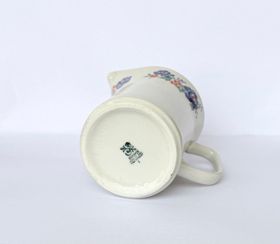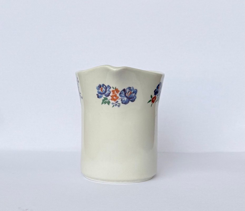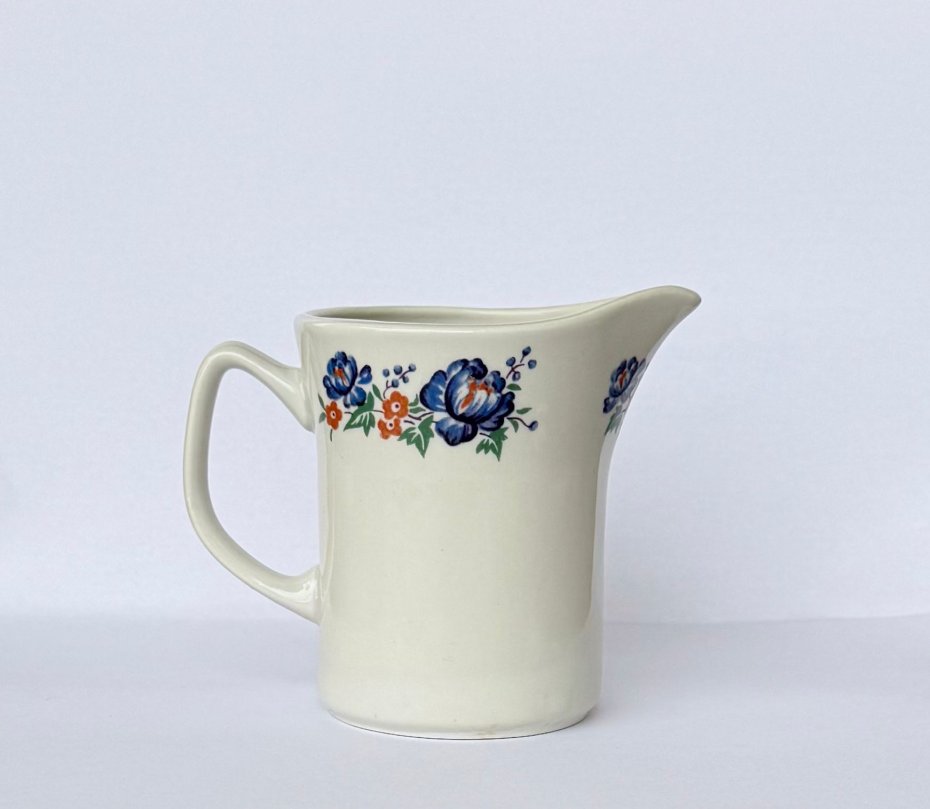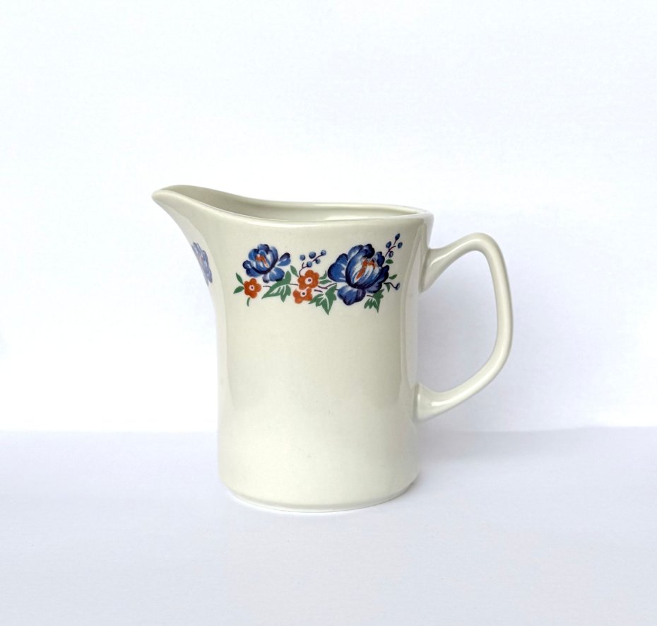 Elegancki mlecznik wykonany z białej porcelany w zakładach we Włocławku lata 60/70 XX wieku. Przedmiot zdobi wyrazisty motyw niebieskich kwiatów rzadziej spotykany niż wyroby fajansowe z tej wytwórni.