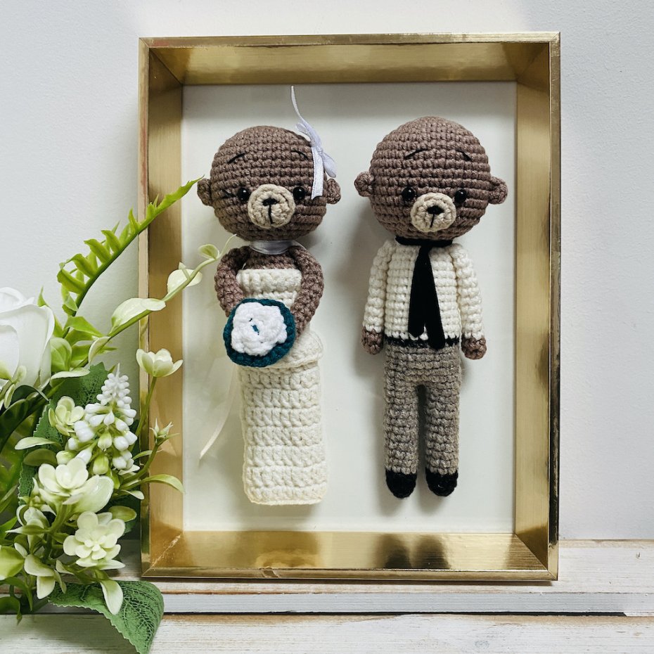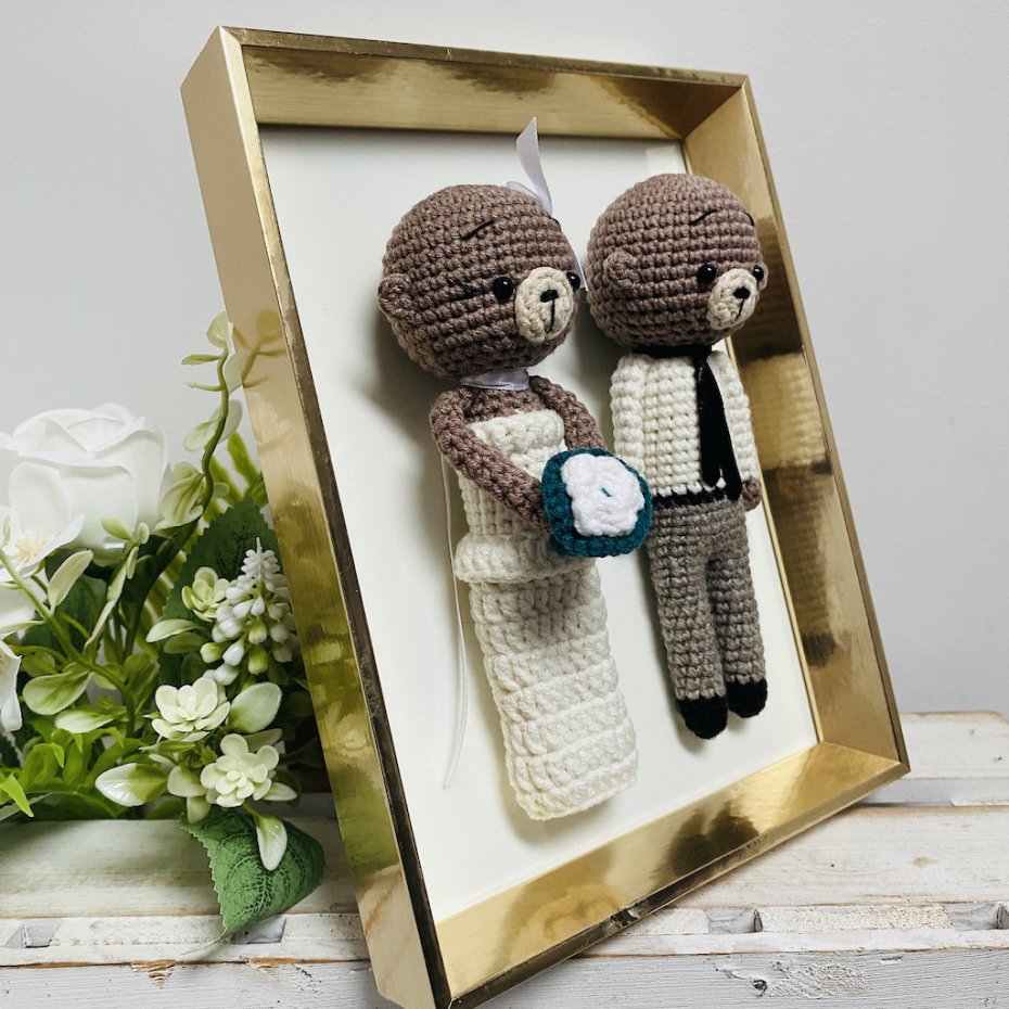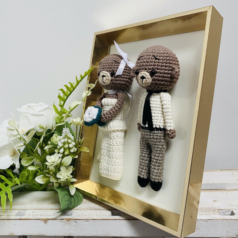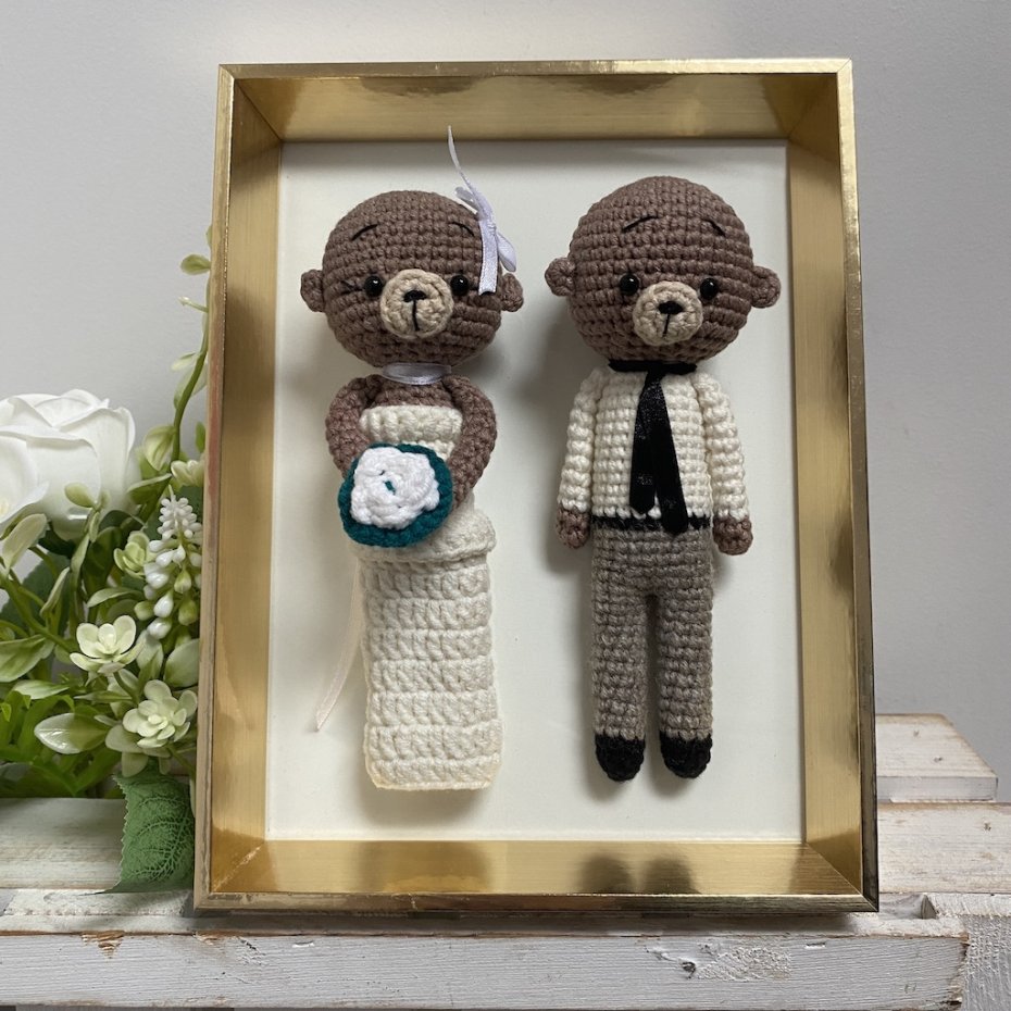 Szukasz unikalnego prezentu ślubnego? Te ręcznie wykonane, szydełkowe misie w ramce stanowią oryginalną pamiątkę ślubu, podziękowanie dla gości lub subtelną dekorację weselną.