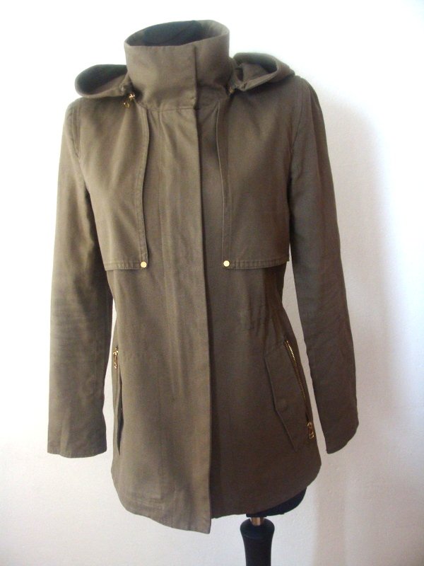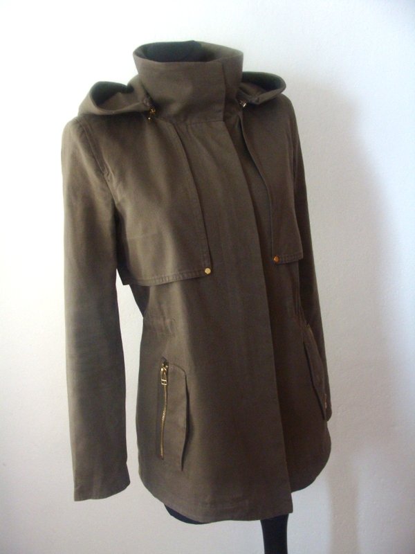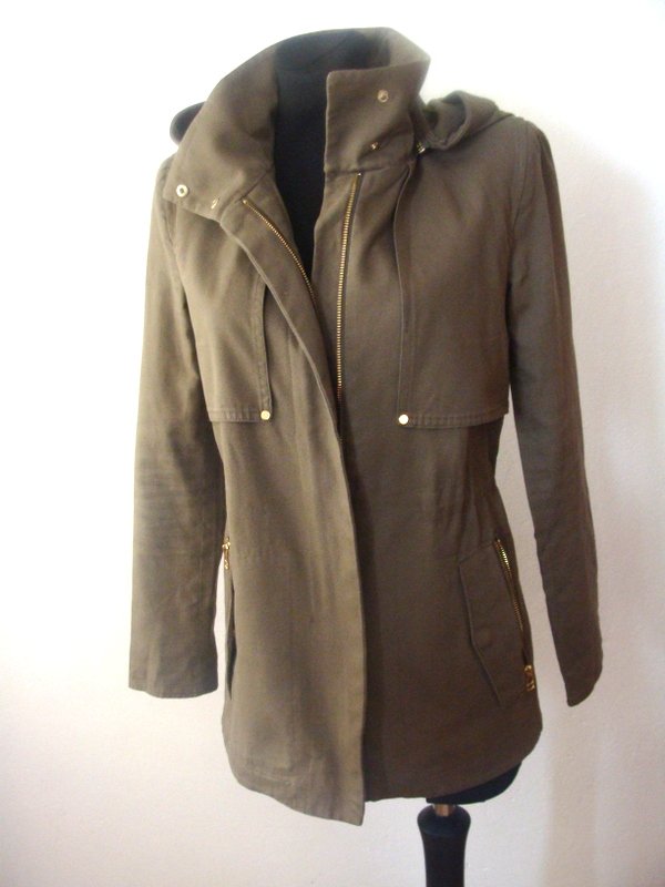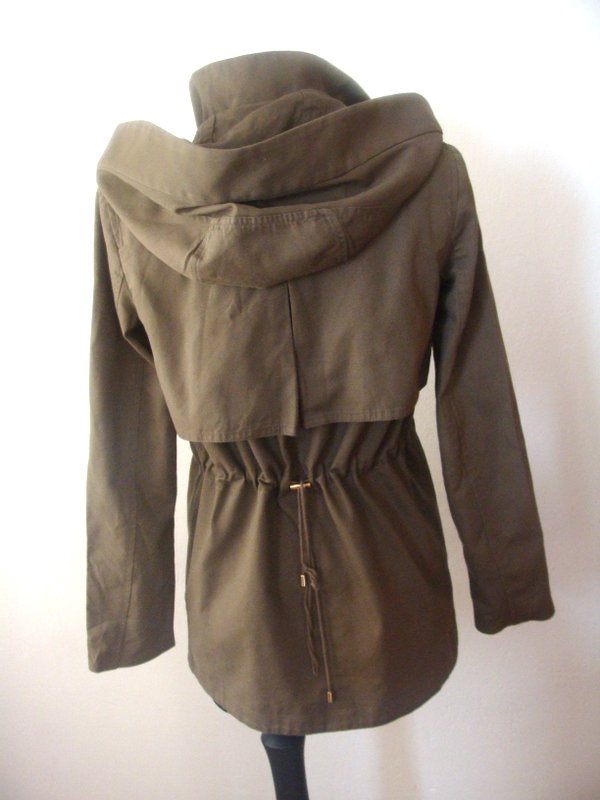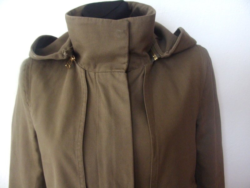 Zgrabna kurtka z bawełnianej tkaniny w kolorze zgniłej zieleni z licznymi detalami, elementy metalowe w złotym kolorze. Z kołnierzem typu wyższa stójka, z dopinanym na zamek kapturem. Ściągana troczkami w talii, z przodu i z tyłu a' la pelerynka, u dołu dwie wpuszczane kieszenie z zamkami. Zapinana na zamek ukryty pod plisą. Całość na podszewce.