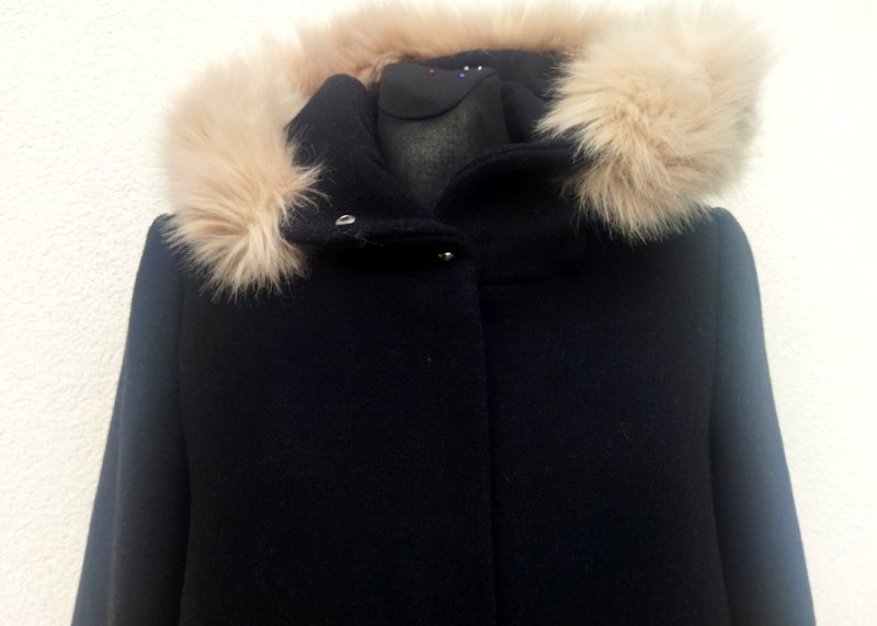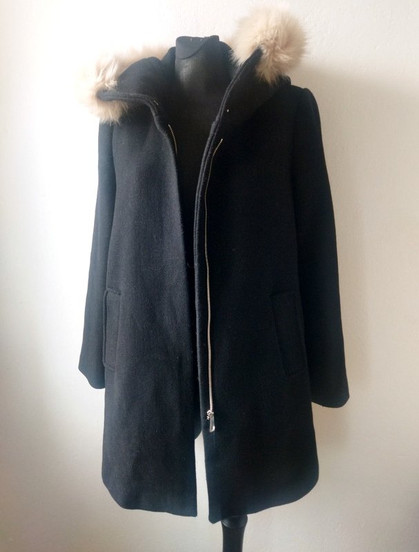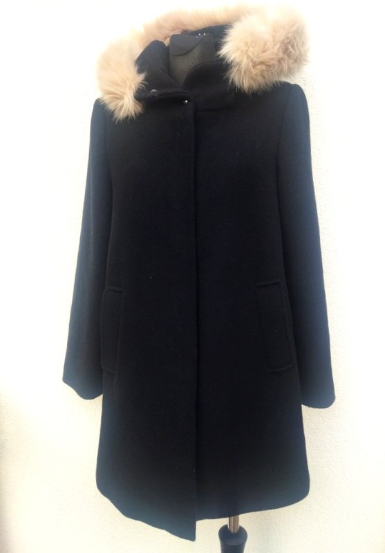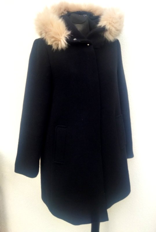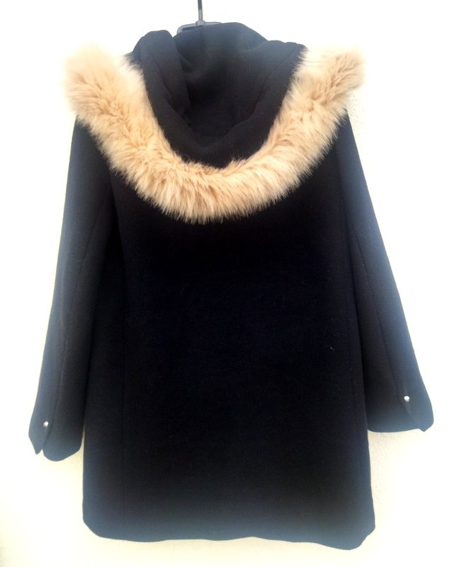 Fajny płaszcz z dużym udziałem wełny w składzie, w czarnym kolorze .Trapezowy fason z kapturem z dopinanym beżowym futerkiem, z dwiema wpuszczanymi kieszeniami. Zapinany na zamek ukryty pod plisą. całość na podszewce