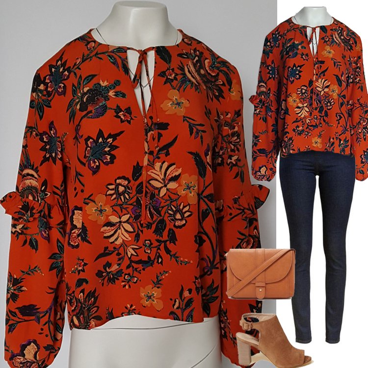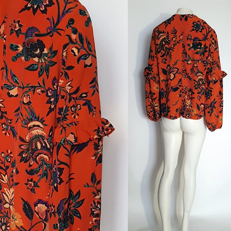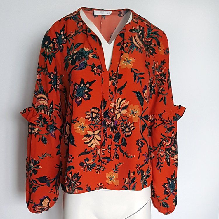 Bluzka w kolorze pomarańczowym w motywy kwiatowe, przy szyi wiązana. Rękawy długie zebrane gumką zdobione falbankami. Tył zakończony półokragło nieco dłuższy niż przód.