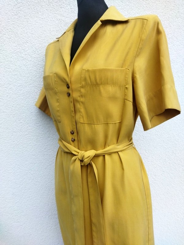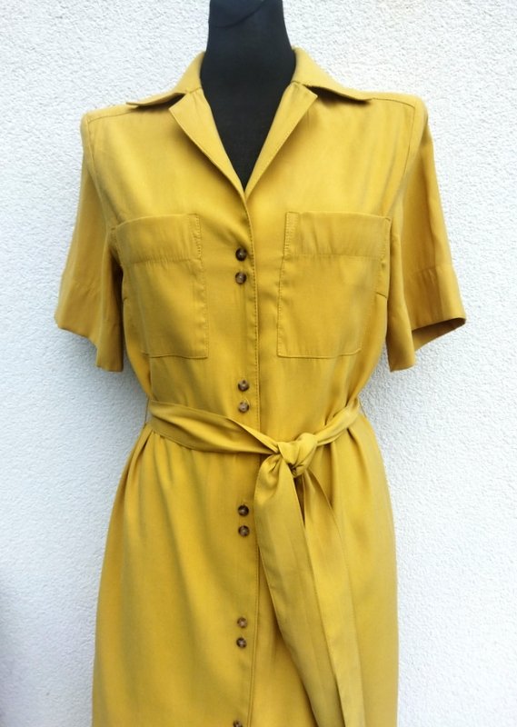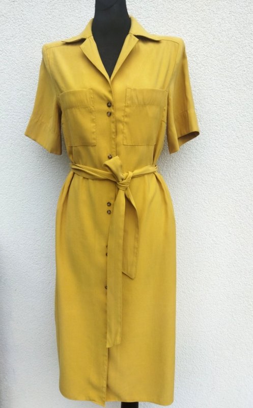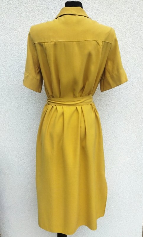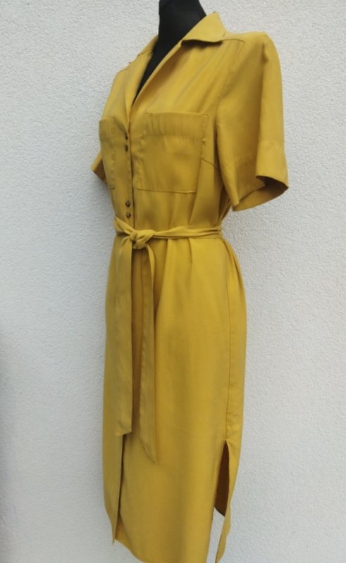 Sukienka typu elegancka szmizjerka z wiskozowej tkaniny w kolorze miodowej żółci . Z kołnierzykiem z rewersami, z dwiema naszywanymi kieszeniami, z rozcięciami po bokach, z karczkiem z tyłu z dwiema płytkimi zakładkami. zapinana na całej długości na małe guziczki . Wiazana paskiem w talii.