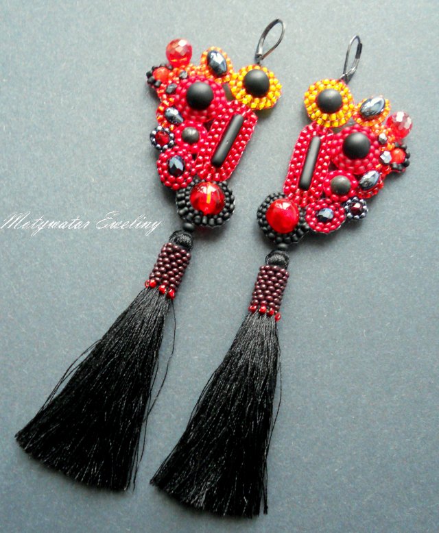 Bardzo długie, oryginalne i niezwykle efektowne kolczyki z chwostem wykonane w całości swoistą techniką haftu drobnymi, szklanymi koralikami w połączeniu z onyksem i hematytem. Dwustronne, podwieszone na biglach posrebrzanych i oksydowanych nieuczulających typu angielskiego. Wymiary kolczyków: długość wraz zapięciem - 14,5cm, szerokość max. 3,5cm. Wykonane w jedynym egzemplarzu.
