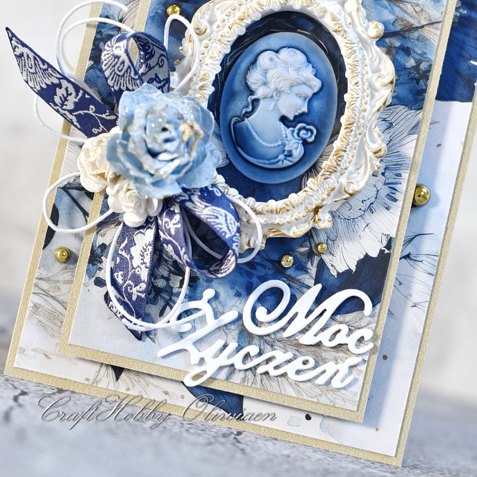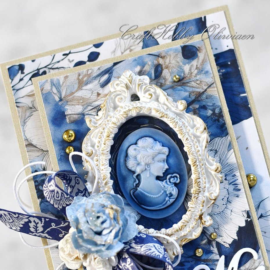 Kartka wykonana z bezkwasowych papierów do scrapbookingu i złotego perłowego kartonu, ozdobiona misterną, przecieraną na złoto ramką z masy plastycznej, piękną kameą na granatowym tle, kwiatami mulberry, dwustronną wzorzystą wstążką, sznureczkiem i złotymi perełkami.
