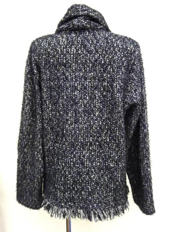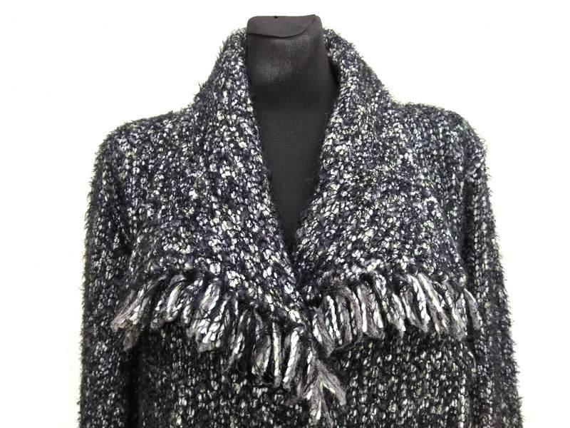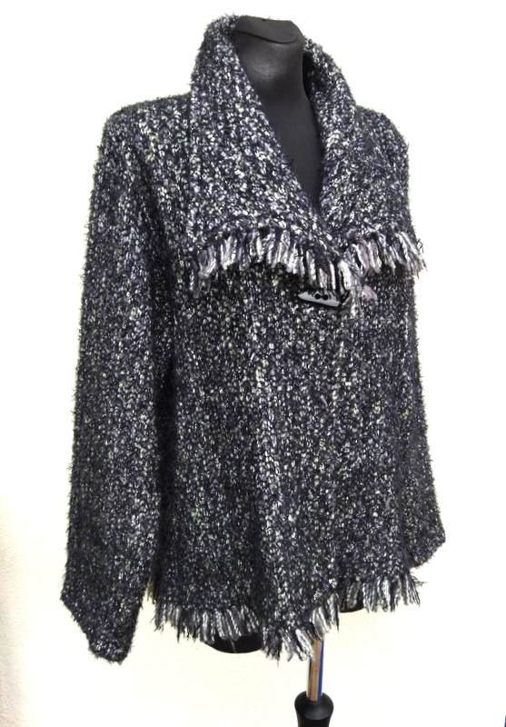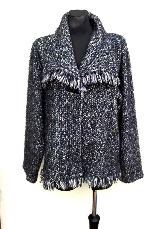 Włochaty dzianinowy żakiet lub sweter w melanżowym czarno- szaro - białym kolorze. Wykończony frędzelkami u dołu przy kołnierzu . Zapinany u góry na jeden Ozdobny podłużny guzik. Bez podszewki,