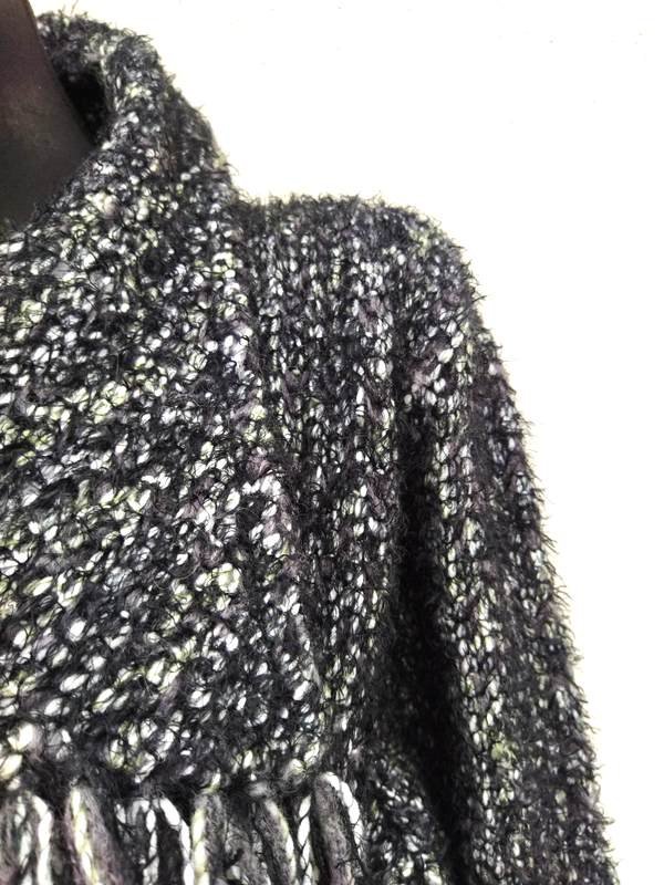 Włochaty dzianinowy żakiet lub sweter w melanżowym czarno- szaro - białym kolorze. Wykończony frędzelkami u dołu przy kołnierzu . Zapinany u góry na jeden Ozdobny podłużny guzik. Bez podszewki,