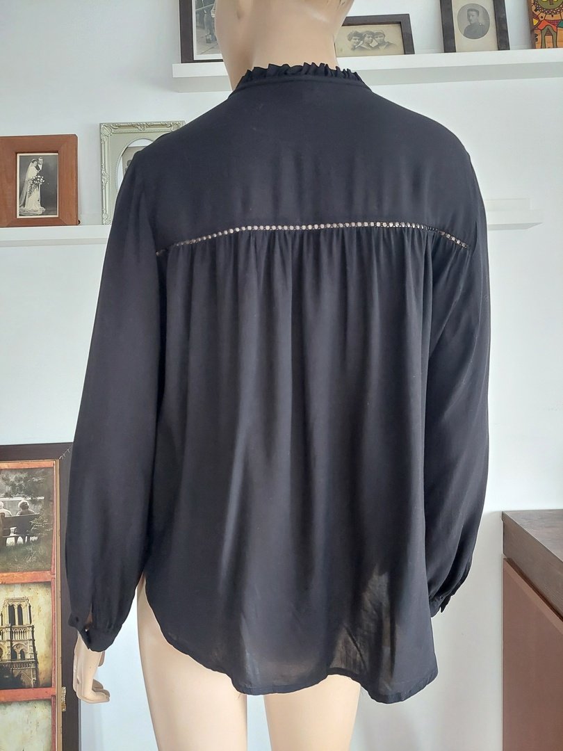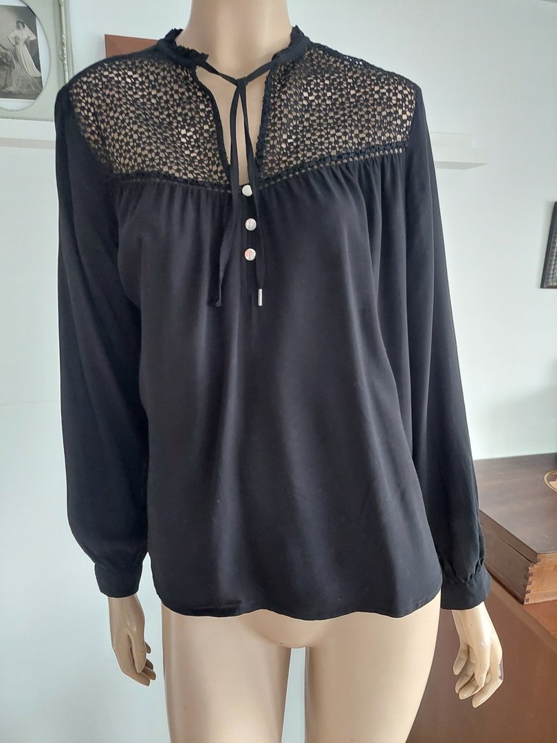 czarna bluzka marki s oliver, ze 100% modalu, ozdobny karczek z przodu, z tyłu mereżka. stan bardzo dobry. rozmiar z metki 40. na manekinie o rozmiarze 38.