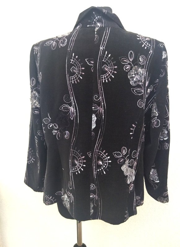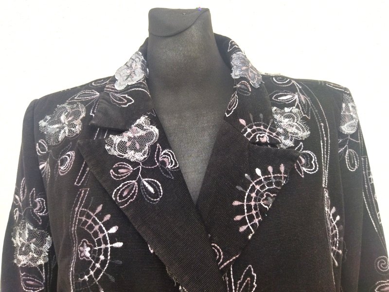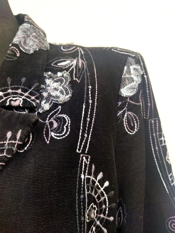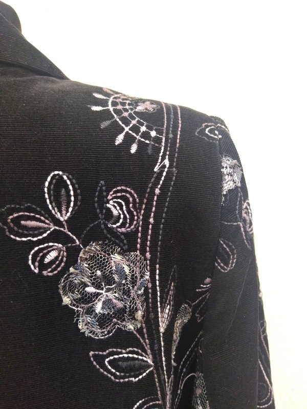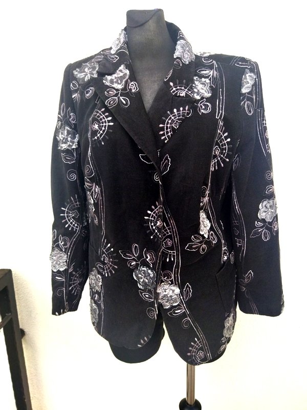 Marynarka z ciekawej tkaniny w czarnym kolorze ze sztruksową fakturą z haftami i naszywanymi kwiatowymi aplikacjami z koronkowych i poliestrowych cienkich tkanin w jasnoszarych kolorach. Lekko taliowana , z kołnierzem z rewersami z dwiema naszywanymi kieszeniami. Zapinana na trzy guziki. całość na podszewce.