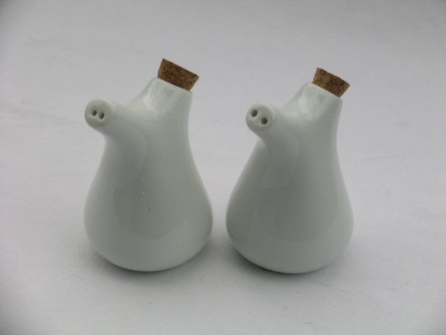 Porcelanowy duet na sól i pieprz. Minimalistyczne, organiczne i nowoczesne wzornictwo. Każde naczynko z dwiema dziurkami; koreczki naturalne. Nie sygnowane. Na błyszcząco szkliwione. 5 x 7 cm. Stan zachowania bardzo dobry.