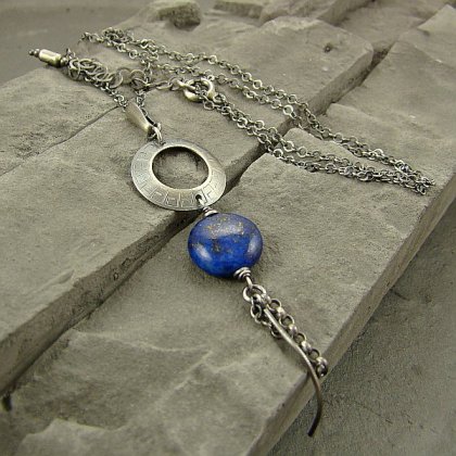 Nowoczesny, kobiecy i oryginalny naszyjnik na co dzień i nie tylko. Wykonany w całości z oksydowanego srebra próby 925 praz pastylki lapisu lazuli wielkości 1,2 cm. Wielkość koła nad lapisem to 1,8 cm . Całkowita długość wisiorka to ok. 8 cm, a długość łańcuszka to 45 cm plus regulacja 4,5 cm. Ozdobnie zapakowany.