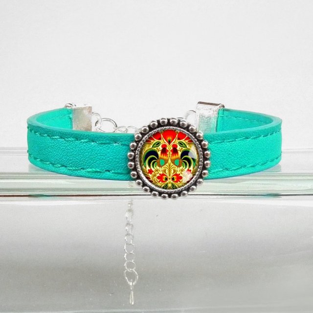 Modna bransoletka, ręcznie wykonana, z unikatową grafiką artystyczną umieszczoną pod wypukłym szkłem tzw. kaboszonem, dającym efekt głębi w oprawie w kolorze srebrnym. Grafika jest najwyższej jakości, bardzo wyraźna i nasycona, wywołana na wysokiej klasy papierze fotograficznym. Oczko z grafiką przymocowane do eleganckiego rzemienia ze skóry ekologicznej. Elementy metalowe hipoalergiczne.