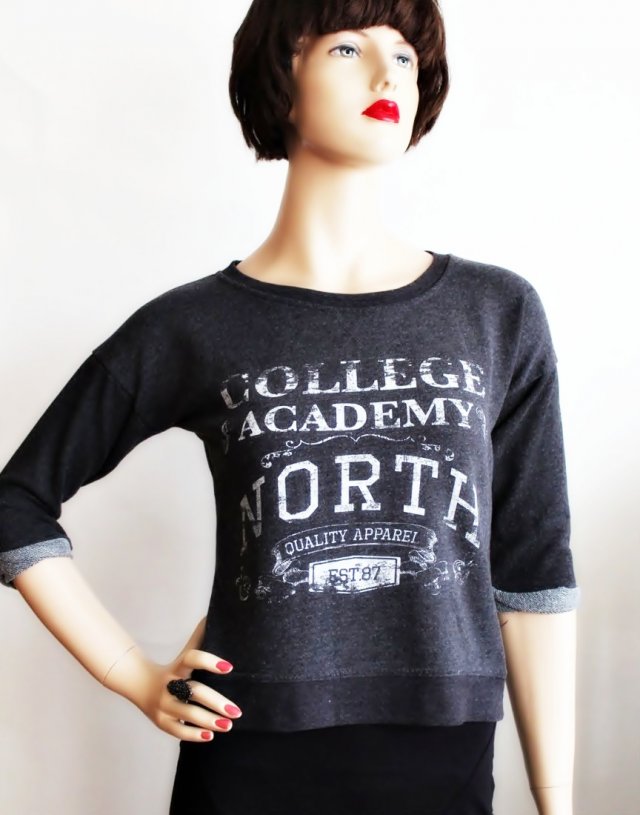 Kolor szary z ciekawą aplikacją. Ciekawie zakończone rękawy. materiał 65% polyester, 35% bawełna. Stan bardzo dobry.