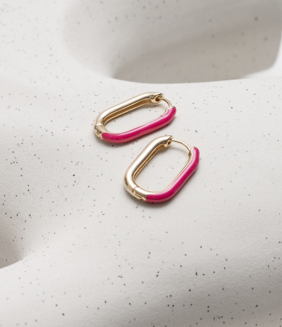 Te minimalistyczne kolczyki ze pozłacanej stali nierdzewnej zachwycają nowoczesną, prostokątną formą, która subtelnie podkreśla elegancję i indywidualny styl. Delikatna warstwa złocenia nadaje biżuterii szlachetnego blasku, a kolorowa emalia wprowadza energetyczny akcent, tworząc harmonijne połączenie klasyki z artystycznym wyrazem.