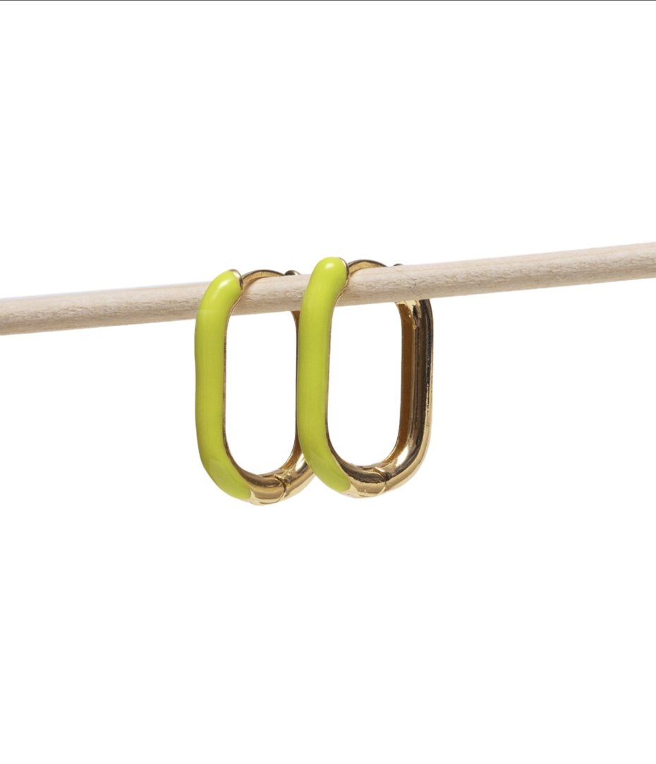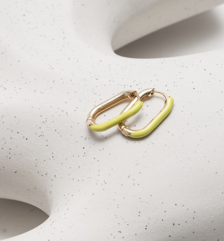 Te minimalistyczne kolczyki ze pozłacanej stali nierdzewnej zachwycają nowoczesną, prostokątną formą, która subtelnie podkreśla elegancję i indywidualny styl. Delikatna warstwa złocenia nadaje biżuterii szlachetnego blasku, a kolorowa emalia wprowadza energetyczny akcent, tworząc harmonijne połączenie klasyki z artystycznym wyrazem.