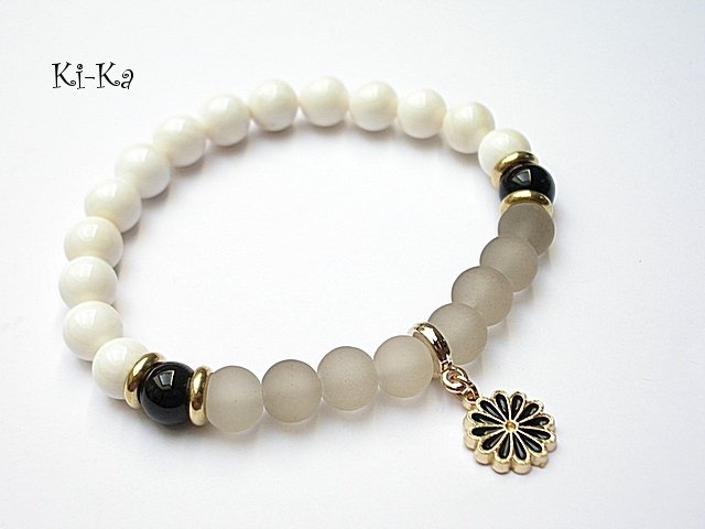 Bransoletka modułowa -każda jedna z tej serii będzie się dobrze komponowała z każdą inną bransoletką z serii Modułowych -przykładowe zdjęcia. Bransoletka wykonana ze szklanych kuleczek [8mm] ,szklanych matowych kuleczek [8mm] ,kuleczek muszli [8mm] oraz metalowych elementów w kolorze jasnego złota. Bransoletka pasuje na nadgarstek 16-17cm. Biżuteria ozdobnie zapakowana. Możliwość dopasowania do nadgarstka - wcześniej prosimy o kontakt.