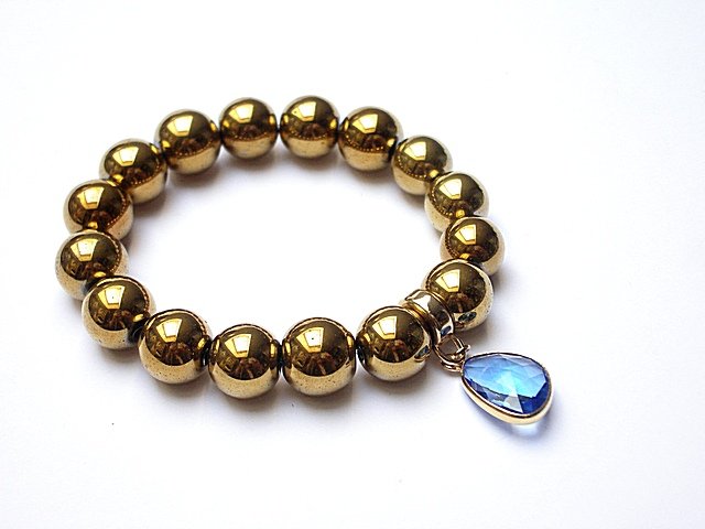 Bransoletka modułowa - każda jedna z tej serii będzie się dobrze komponowała z każdą inną bransoletką z serii Modułowych - przykładowe zdjęcia. Motyw przewodni tej serii - kolor granatowy. Bransoletka wykonana z naturalnych kamieni duże kule hematytu [12mm], efektownej przywieszki ze szkła oraz metalowych elementów w kolorze tzw. różowego złota. Bransoletka pasuje na nadgarstek 15,5-16,5cm. Biżuteria ozdobnie zapakowana. Możliwość dopasowania do nadgarstka - wcześniej prosimy o kontakt.
