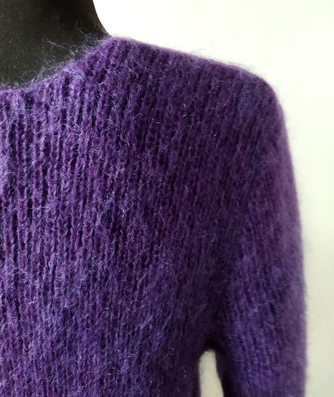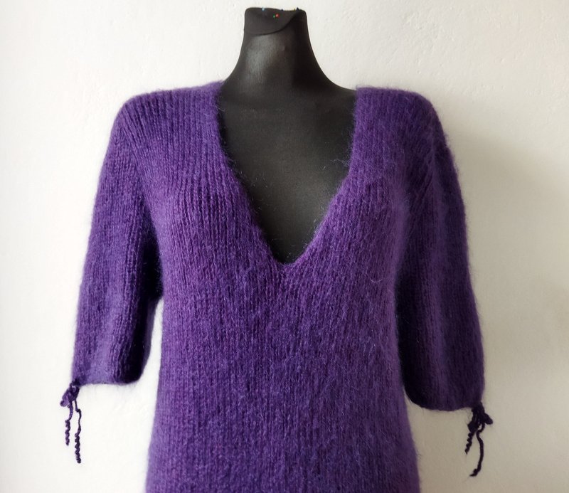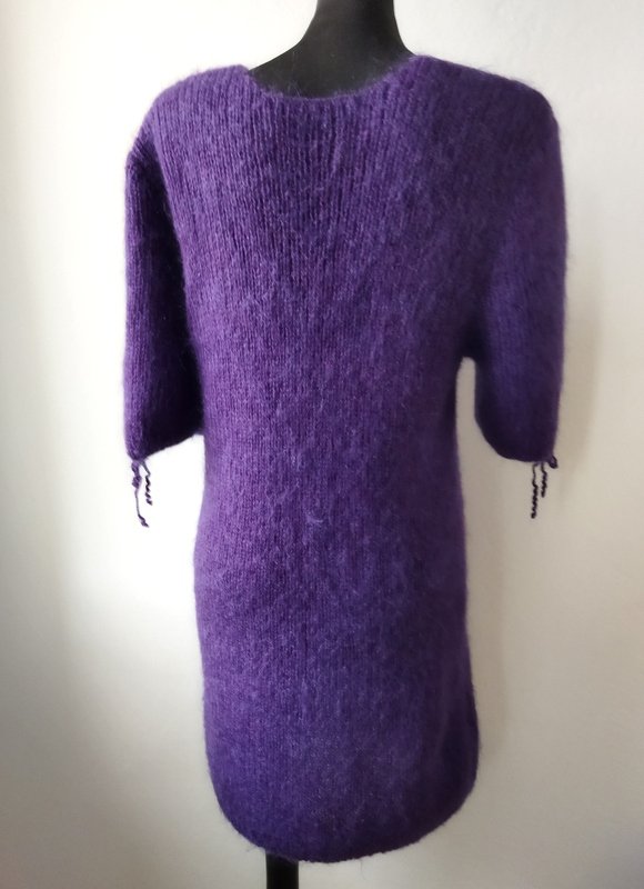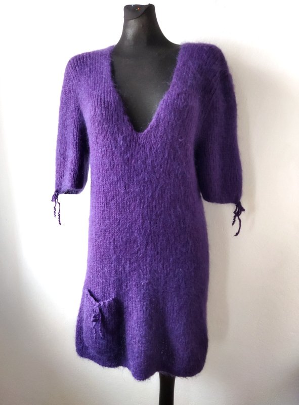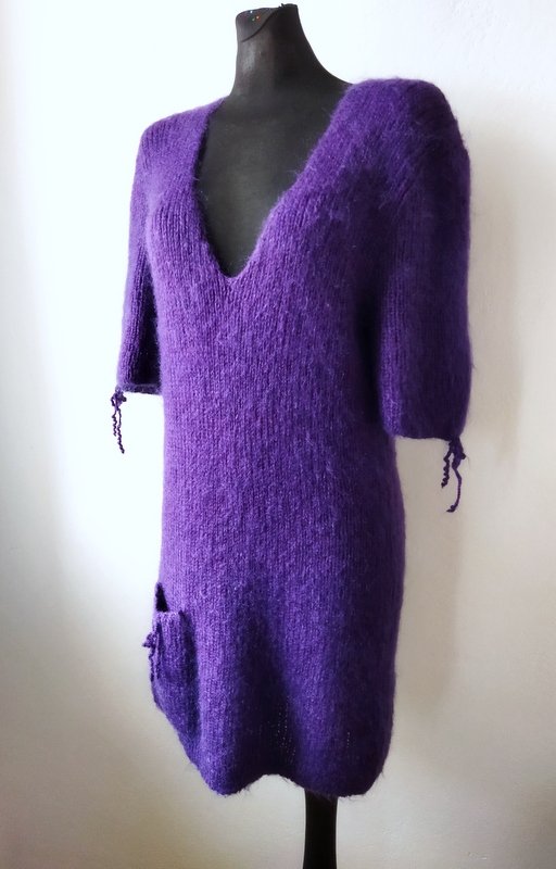 Sukienka z moherowej włóczki w kolorze nasyconego fioletu. z dekoltem w szpic , z rękawkami ściąganymi u dołu sznureczkiem z włóczki, z dwiema naszywanymi kieszeniami ściąganymi sznureczkiem z włóczki. Puszysta , ciepła i rozciągliwa