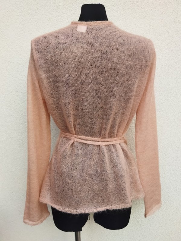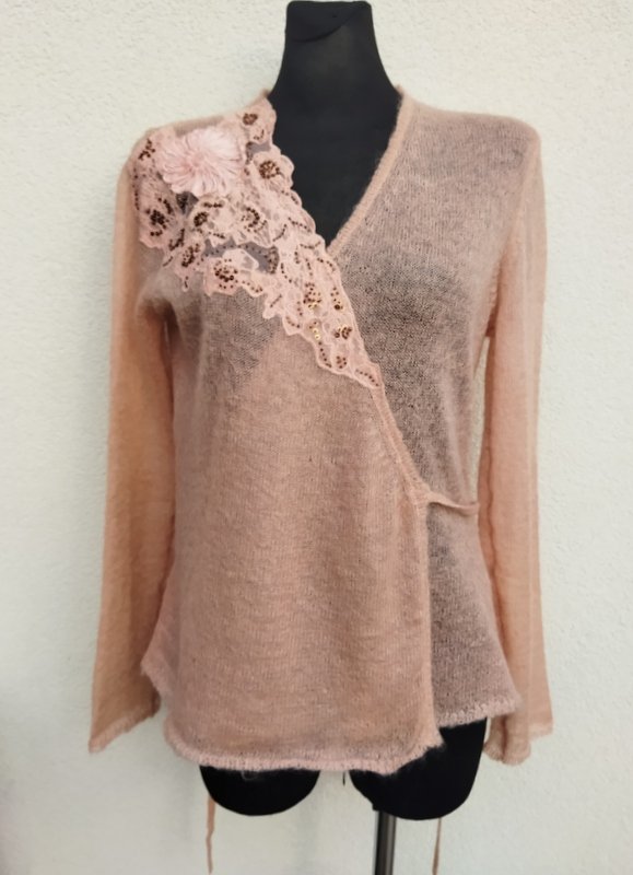 Piękny sweterek z cienkiej moherowej włóczki z domieszką, w pięknym odcieniu antycznego różu. zakładany kopertowo, wiązany troczkami z jednego boku u góry aplikacja z koronkowej tkaniny zdobiona miniaturowymi koralikami.