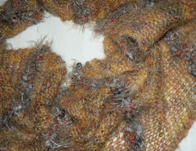Piękny mięciutki szalik z moherowej włóczki w nieregularnych odcieniach brązu. Wykończony długimi frędzlami.