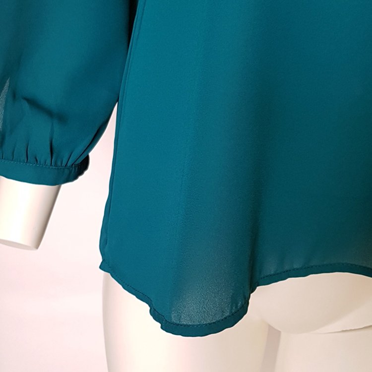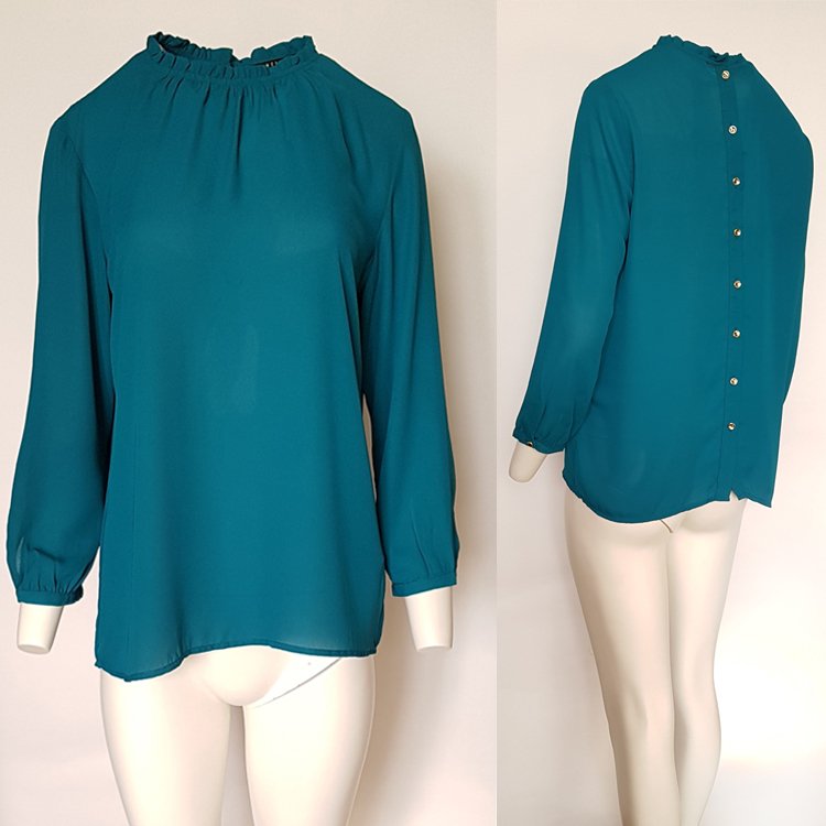 Bluzka damska w kolorze szmaragdowym, krój prosty, luźny, przy szyi marszczona, wykończona mini falbanką. Z tyłu zapinana na całej długości na złote guziczki.
