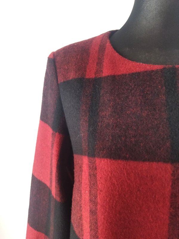 Świetna sukienka z dobrej jakości cieplejszej tkaniny z wzorem w kratę w kolorach burgundowej czerwieni i czerni. Minimalistyczny trapezowy krój, z dwiema wpuszczanymi kieszeniami w szwach bocznych, rękawy z rozsuwanymi zamkami. zapinana z tyłu na zamek . Bez podszewki.