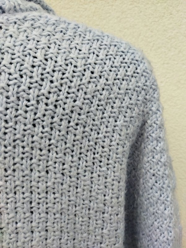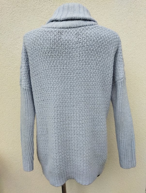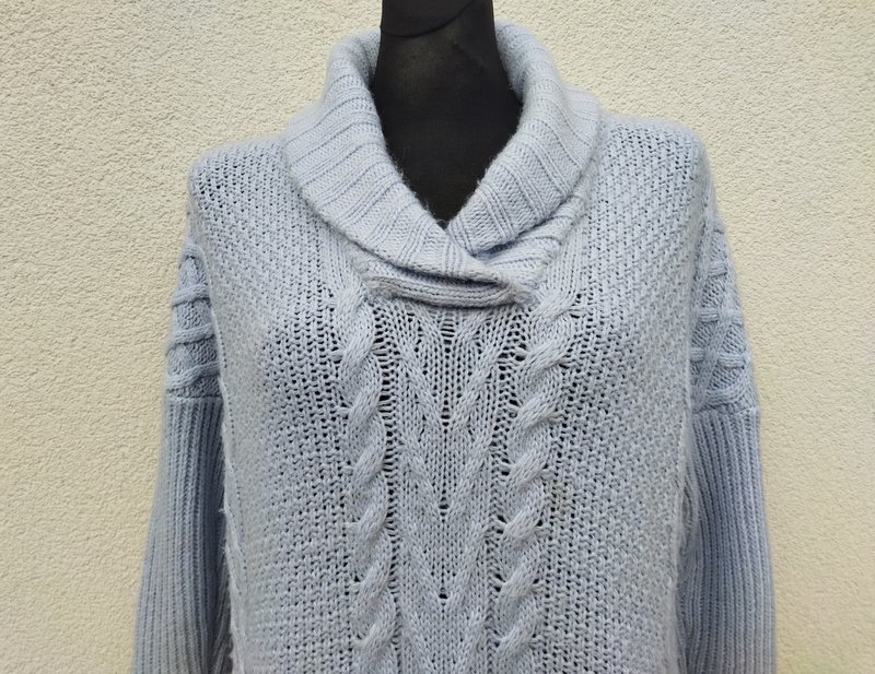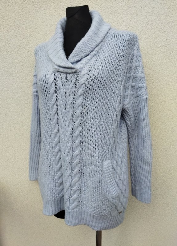 Miły mięciutki sweter w jasnoniebieskim ( błękitnym kolorze) z misternymi wzorami i splotami. Z szalowym kołnierzem , z obniżoną linią ramion, z dwiema wpuszczanymi kieszeniami. Wykończony ściągaczami.