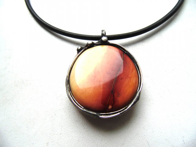 Wisiorek wykonany techniką witrażową z miedzi, cyny i jaspisu mokaitu. Zawieszony na czarnej lince kauczukowej o długości ok. 45 cm. Wymiary ok. 4 na 3 cm.