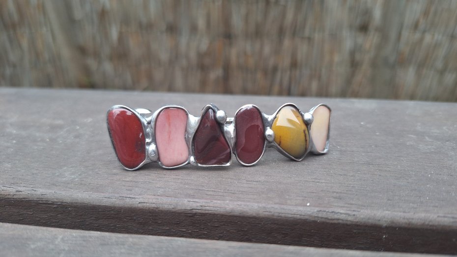 Klamra do włosów, wykonana z miedzi, cyny i jaspisów mokaitów. Wymiary ok. 8 na 2 cm. Zapięcie 6 cm, metalowe.