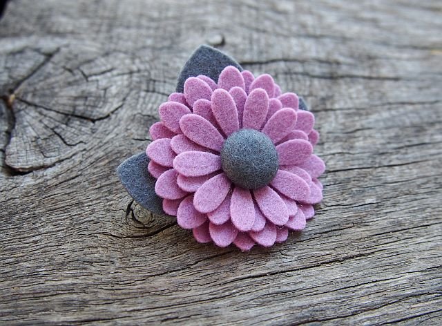 Broszka przypinka kwiatuszek z filcu merino w środku ręcznie robiony guzik Śr. kwiatka ok. 5 cm , zapięcie broszkowe z blokadą. PROJEKT AUTORSKI !