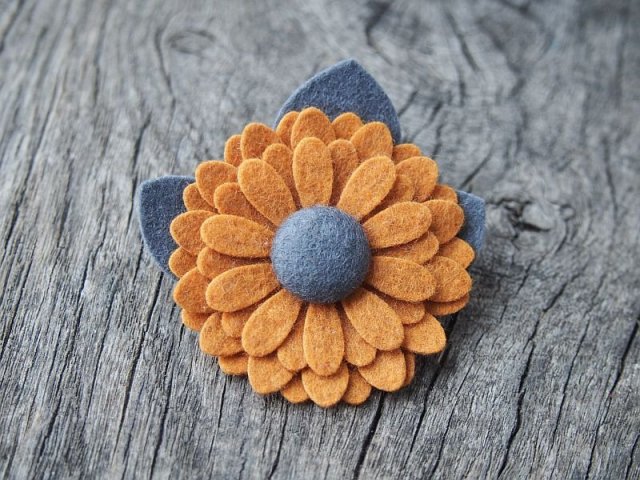 Broszka przypinka kwiatuszek z filcu merino w środku ręcznie robiony guzik Śr. kwiatka ok. 5 cm , zapięcie broszkowe z blokadą. PROJEKT AUTORSKI !