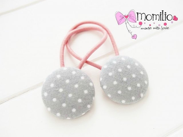 Gumki do włosów zrobione z guzików. Guziki obciągnięte tkaniną w kropeczki