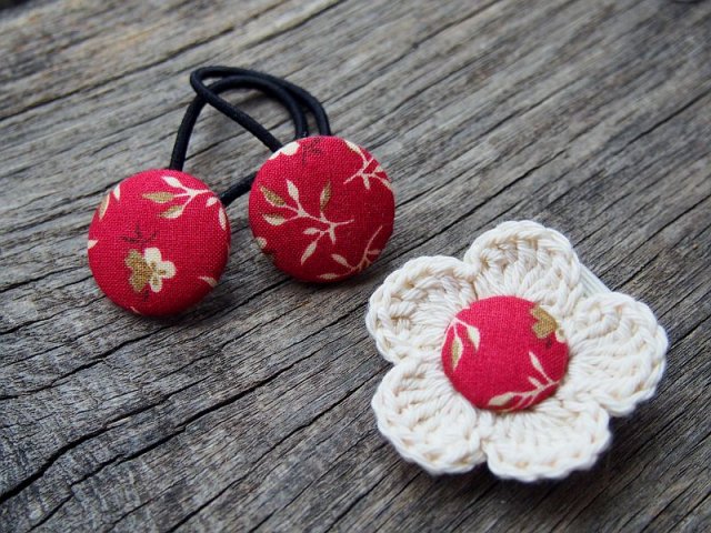 Spinka do włosów szydełkowy kwiatuszek i gumki do włosów wykonane z guzików . Średnica kwiatuszka 5 cm; spinka typu klips dł 4,5 cm, średnica guzika w gumce 2,9 cm.