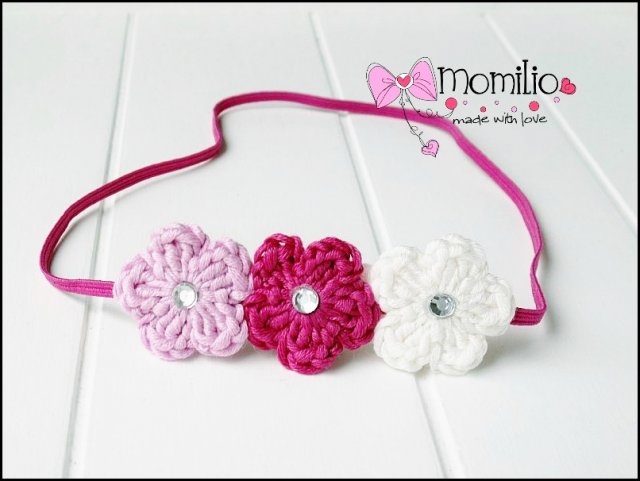 Śliczna opaska do włosów z szydełkowymi kwiatuszkami.