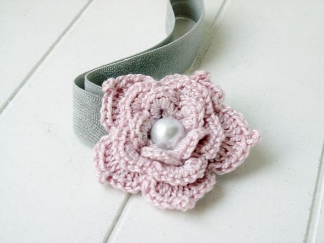 Opaska do włosów ozdobiona szydełkowym kwiatem z kordonka w kolorze brudnego różu. Uszyta z delikatnej elastycznej taśmy.