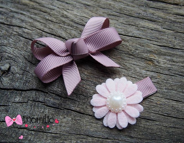 Kwiatuszek i kokardka spineczki do włosów. Kwiatuszek wykonany z filcu merino ozdobiony perełką