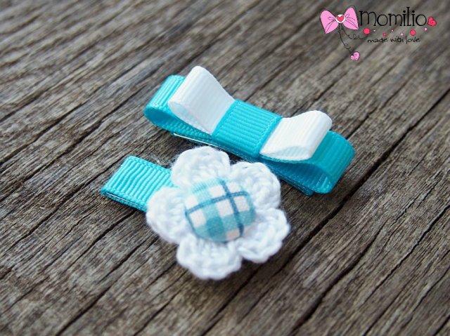 Kwiatuszek i kokardka spineczki do włosów. Kwiatuszek wykonany na szydełku ozdobiony ręcznie robionym guzikiem