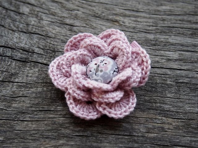 Spinka do włosów. Kwiatek jest zrobiony na szydełku i ozdobiony ręcznie zrobionym guzikiem. Średnica kwiatka wynosi ok. 5 cm Przymocowany jest do spinki mocnym , nietoksycznym klejem bezpiecznym dla dzieci. Spinka typu klips ma 4,5 cm długości i pokryta jest wstążką. Wstążka jest zabezpieczona na gorąco przed pruciem. Kolorystyka spinek:brudny róż, szary