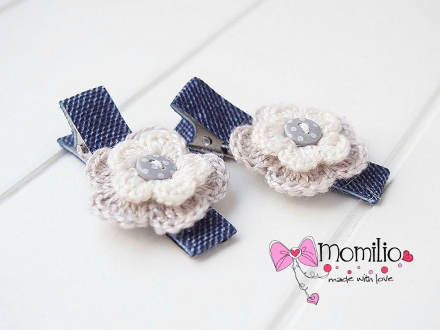 Spinka typu klips dł 4,5 cm kwiatek średnicy 2,8 cm. Kolor szary, mleczna biel, jeansowy.