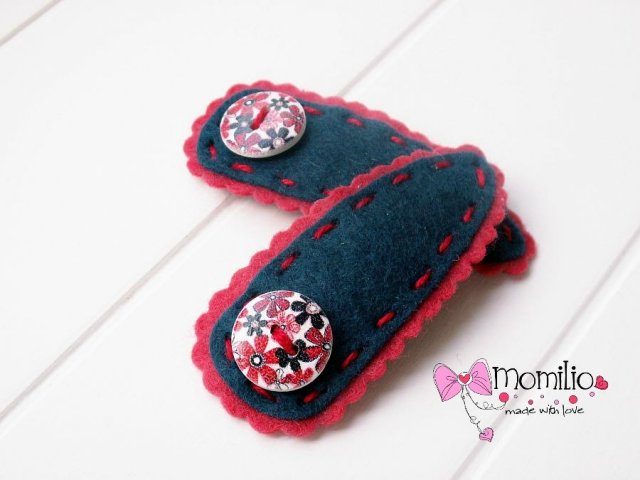 Komplet spinek do włosów z limitowanej kolekcji. Delikatne i lekkie uszyte z filcu bardzo dobrej jakości. Bardzo ładniej prezentują się na włoskach. Spinka typu pyk 5 cm wszyta w środku. Projekt autorski!