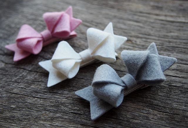 Spinki do włosów kokardki z filcu. Komplet 3 sztuki Dla dużych i małych dziewczynek z bujną czuprynką. Lekkie, dobrze trzymają się na włosach. Wielkość kokardki 3,5cm x 6 cm Spinka typu klips 4,5 cm .