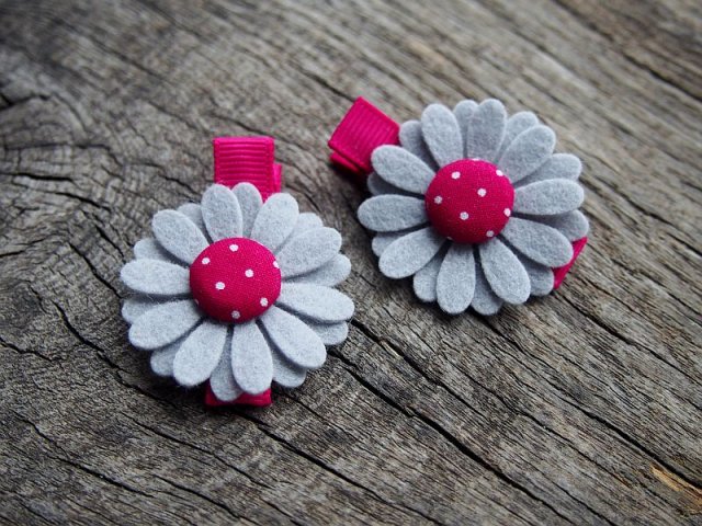 Kwiatuszki z filcu merino ozdobione ręcznie robionymi guziczkami