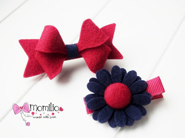 Kokardka i kwiatuszek z filcu merino ozdobiony ręcznie robionym guziczkiem