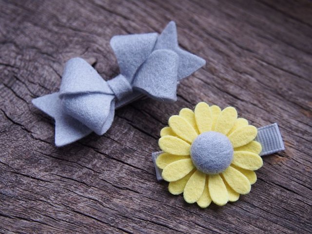 Kokardka i kwiatuszek z filcu merino ozdobiony ręcznie robionym guziczkiem